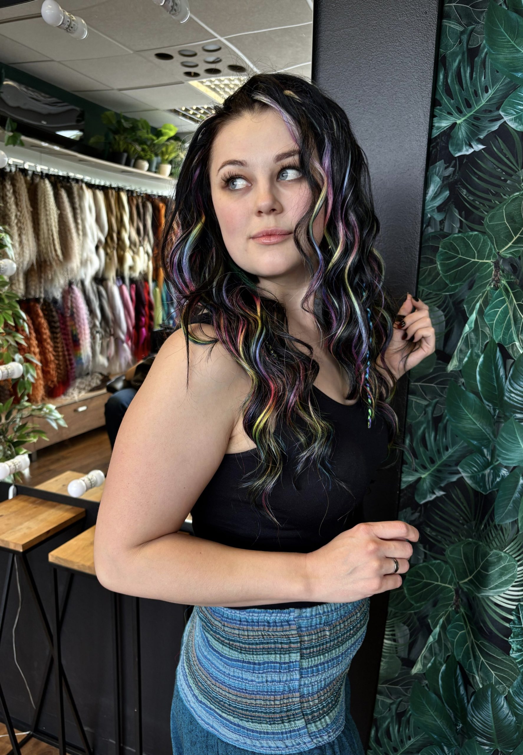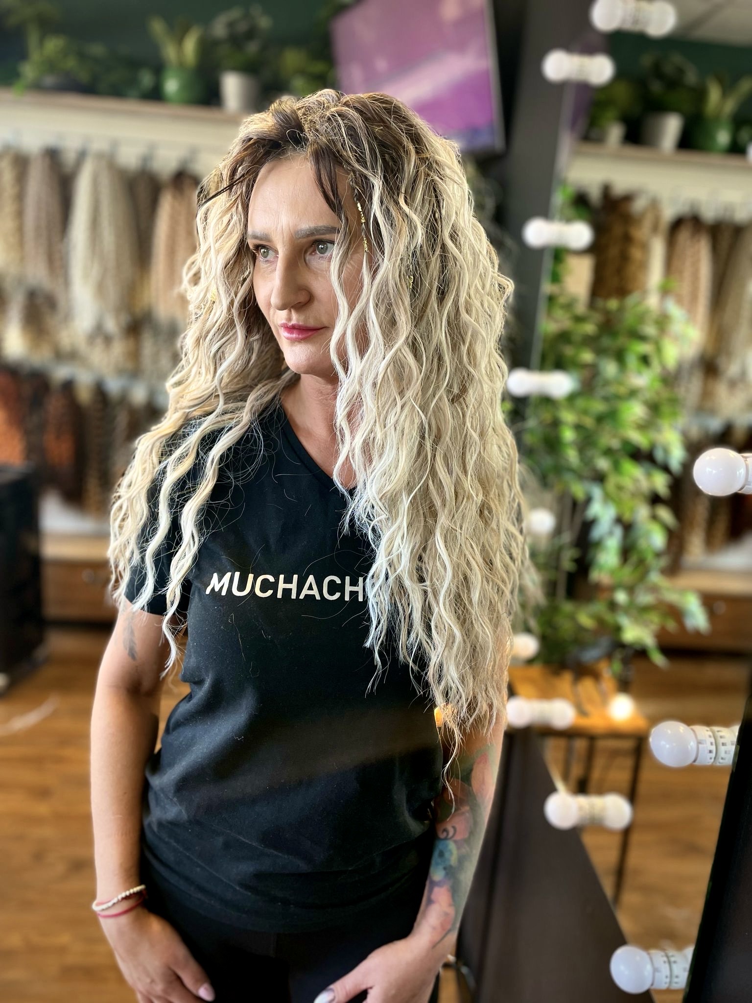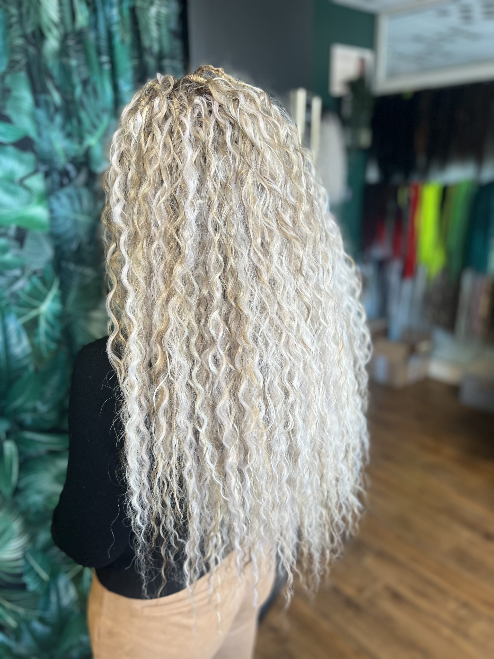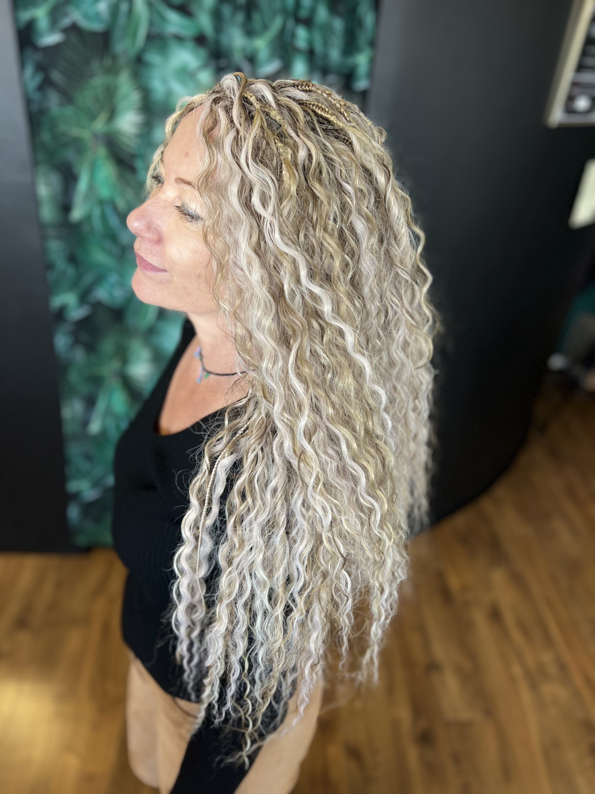 Loczki są umocowane za pomocą warkoczyka do naszych włosów. W tej wersji robimy ok 50-70 łączeń. W efekcie końcowym po rozchyleniu włosów wewnątrz można zauważyć małe warkoczyki przeplatające się pomiędzy lokami.