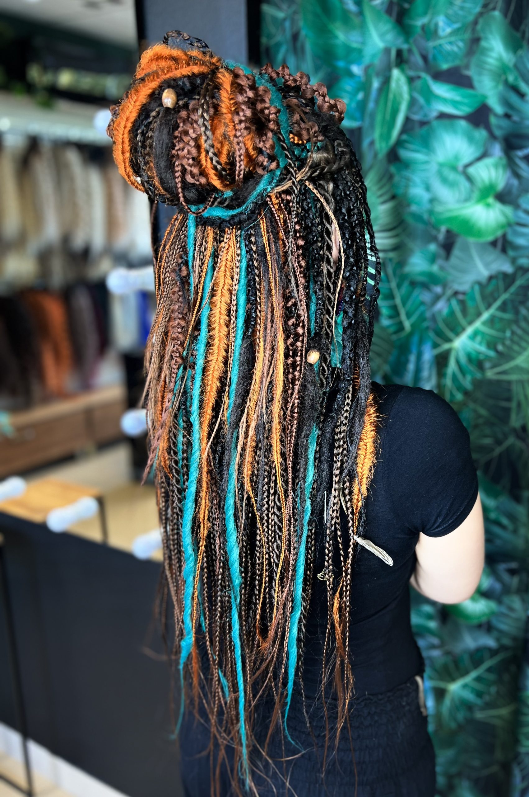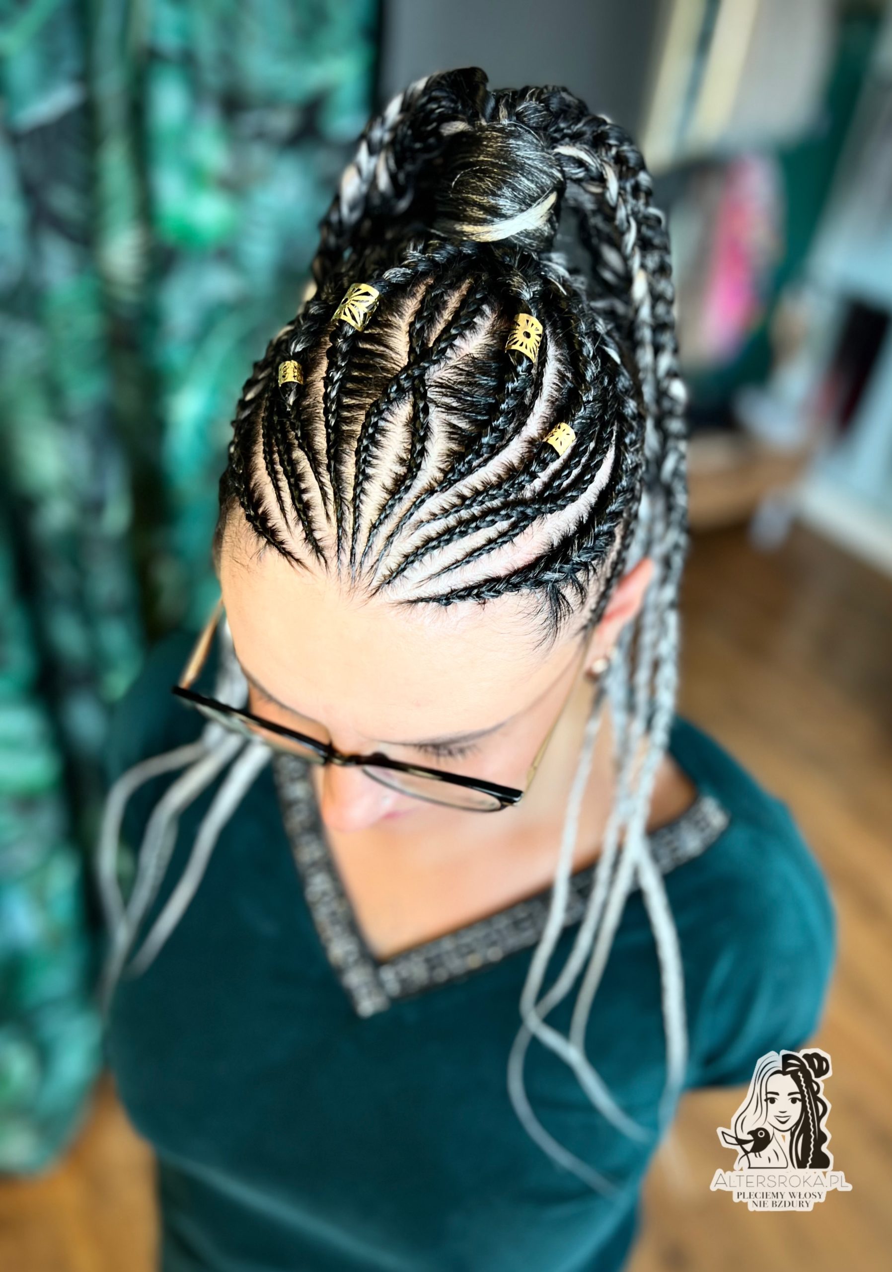 Fryzura polega na zapleceniu naturalnych włosów w warkocze dobierane, z których jednostronnie wypuszczone są luźne pasma syntetycznych włosów.