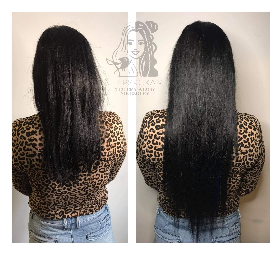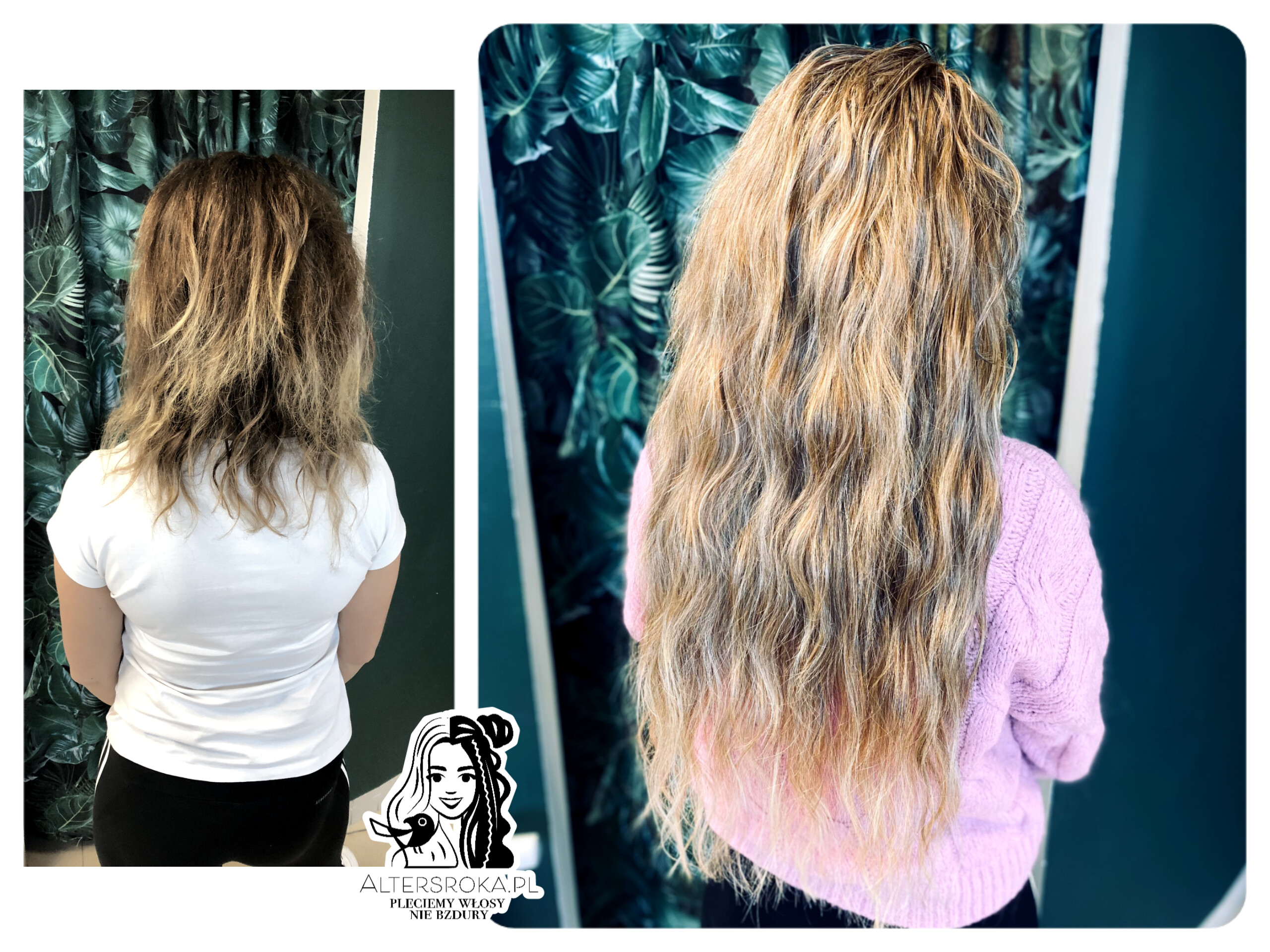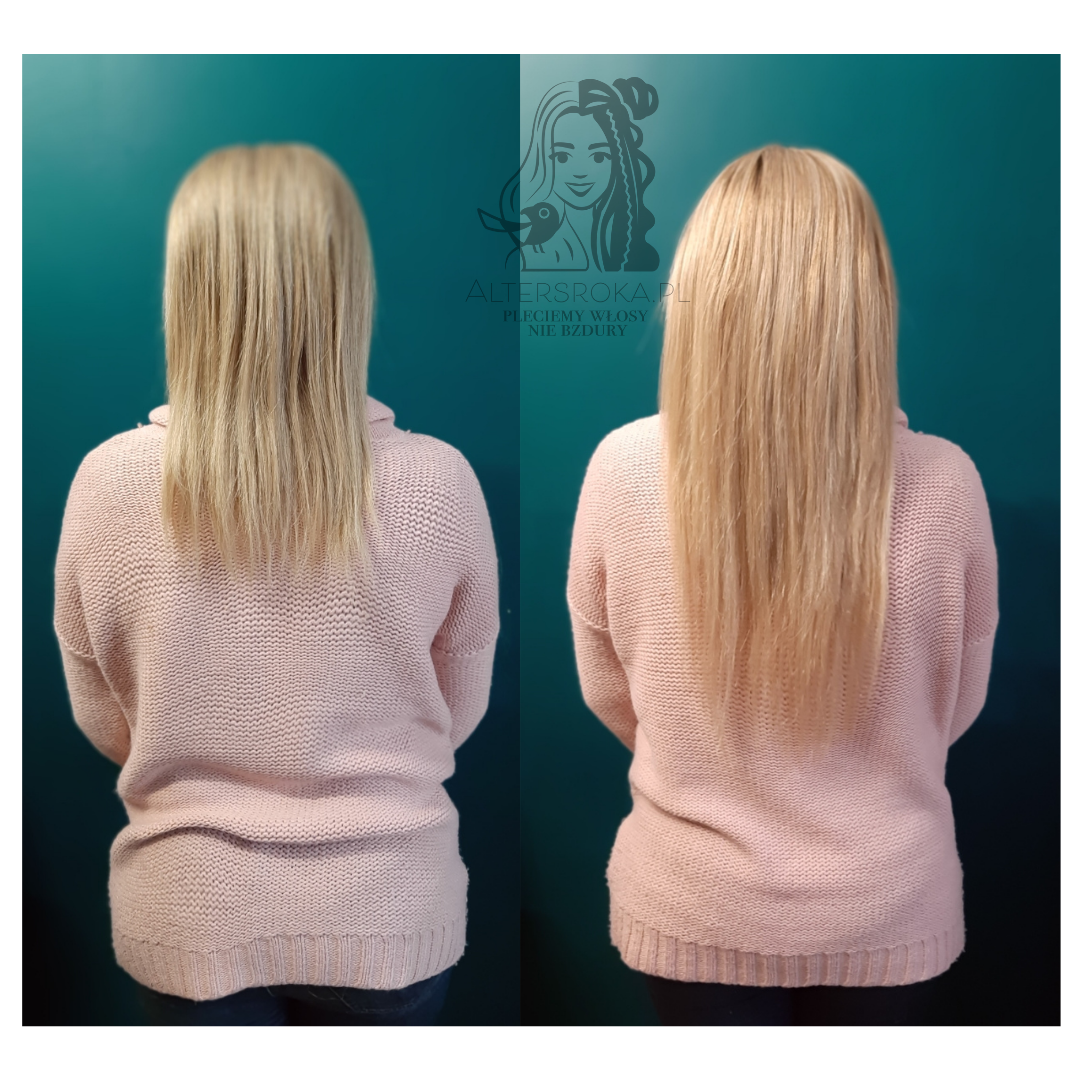 Przy metodzie szytych taśm długość i gęstość włosów nie zmienia się w trakcie likwidacji odrostów co 2-3 miesiące. Czyli zdejmujemy taśmy z warkocza, rozczesujemy włosy, zaplatam nowy świeży warkocz i wszywam gotową taśmę na świeży warkoczyk.